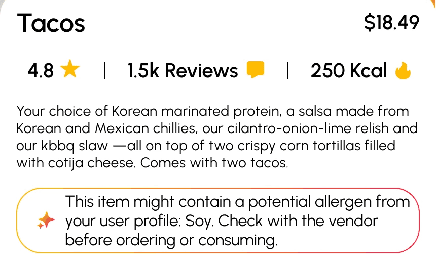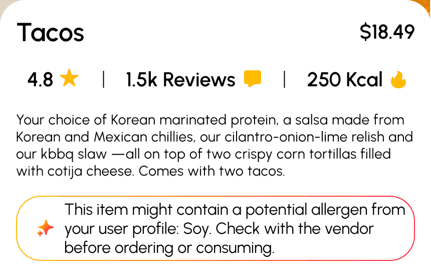 AI improves the checkout process by proactively scanning the user’s order for allergens they’ve marked in their profile and flagging any risks before payment. It also predicts low-stock or out-of-stock items based on vendor trends so users don’t waste time ordering something that won’t be available
