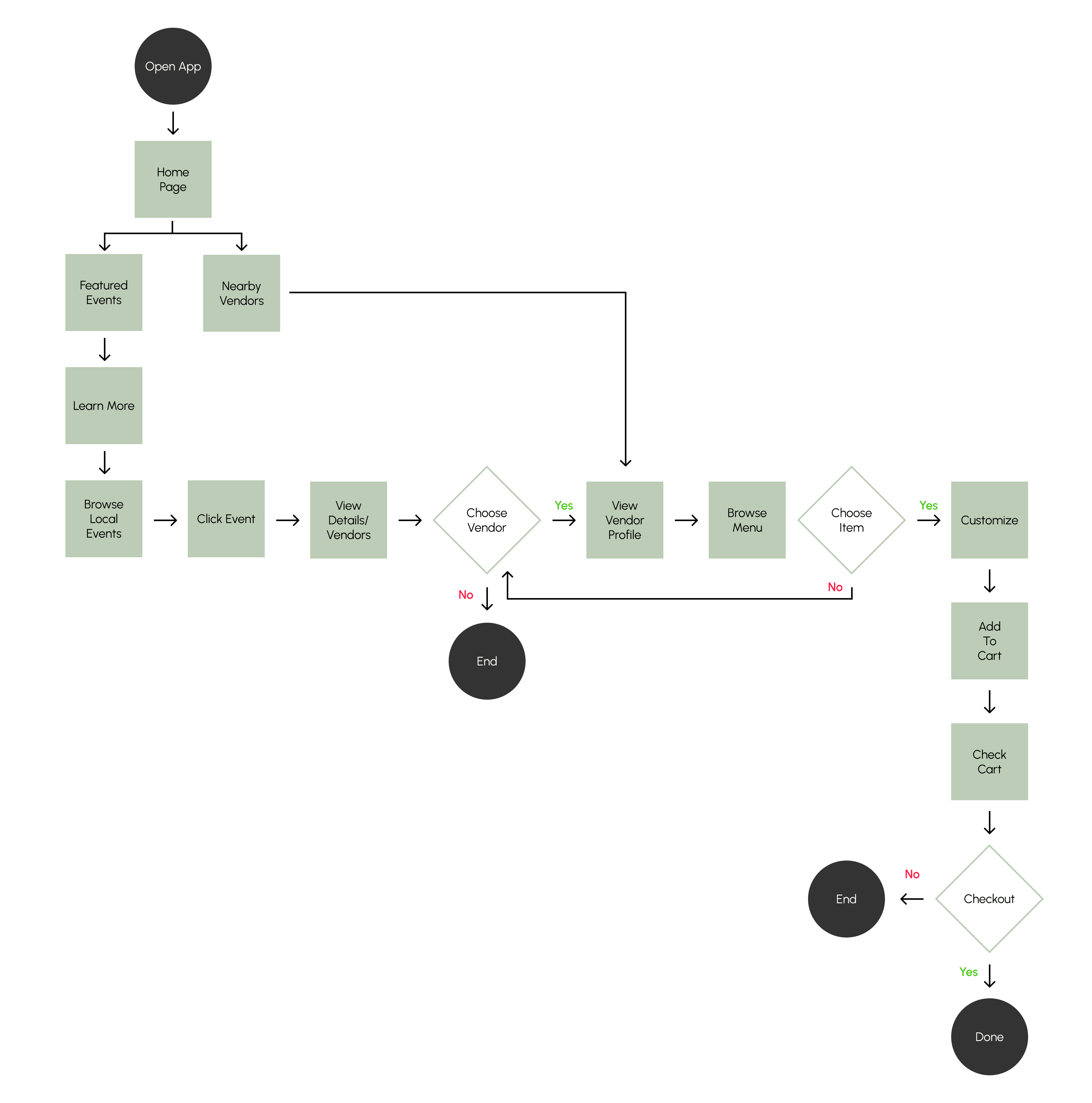 Making a user flow helped me map out each step the user would take in the app, from entry to final action. This helped me determine the types of screens that I would want to design for.