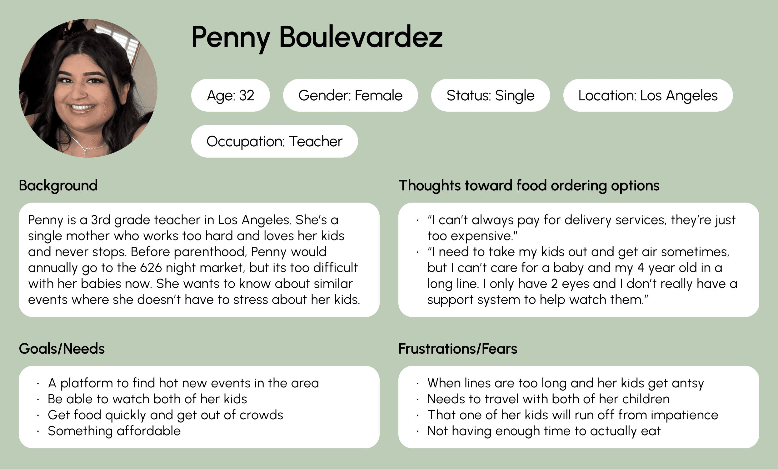 To expand my design perspective, I created personas from varied backgrounds. One was inspired by my experience as a new uncle observing the changes in my sibling's life after having a kid. I wanted to highlight the challenges of a young parent managing a child while ordering food.