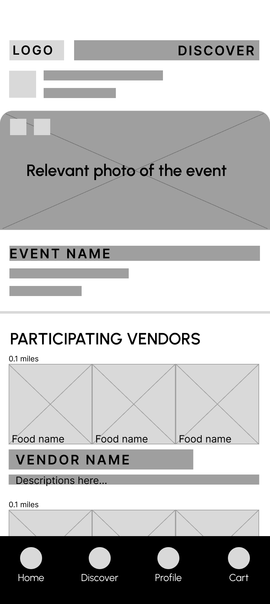 Based on research, I focused on improving the end-to-end experience from event discovery → vendor browsing → ordering → pickup. Below is the evolution of this flow, from early sketches to final designs.